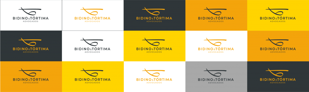 Para a base do padrão cromático, combinamos o valor do amarelo com a seriedade e robustez do chumbo. Cores que, quando combinadas, representam o momento e a experiência da Bidino & Tórtima Advogados e que, por serem bastante diferentes daquelas utilizadas por seus principais concorrentes, garantem uma ligação sensorial e visual do escritório com seus clientes. Os tons – que podem ser usados com 100%, 70% ou 50% de tonalidade – estão devidamente ajustados para representar os principais elementos nessa relação, contribuindo no reconhecimento da Marca por meio de sua identidade.